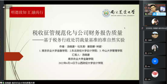 2022年6月14日,suncitygroup太阳新城官网举行了第157次学术论坛,由南京农业大学汤晓健博士做学术报告:税收征管规范化与公司财务报告质量。