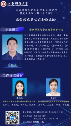 2024年6月28日晚7点至10点,suncitygroup太阳新城官网研究生论坛(第二十六期)成功举办。本次论坛的主题为“数字技术与公司金融风险”,采取线上和线下两种方式同步进行。论坛特别邀请江西财经大学财经数据科学重点实验室副主任、金融学博士生导师王红建教授做主题报告。王红建教授入选2022年财政部高层次财会人才素质提升工程、2019年江西省双千计划,在《经济研究》《管理世界》《管理科学学报》《Journal of Banking and Finance》《中国工业经济》等权威期刊发表论文30余篇,主持国家级和省部级项目各3项,获省部级以上奖项4项。