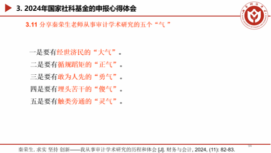 最后,上官泽明副教授结合自身求学与工作经历,讲述了自己申报2024年国家社科基金课题的心得体会。在选题方面,上官泽明老师今年获得的国家社会科学基金一般项目的题目为《多元主体视角下数字技术赋能国家审计整改效果提升研究》。项目的初步选题依据国家政策、新闻报道、重要文献以及学术专著等确定,而后经过多次反复修改与论证确定最终题目。在研究内容方面,上官泽明老师强调了精心绘制逻辑框架图的重要性。在申报书撰写方面,他强调了前期认真学习申报书范本、中后期认真听取校内外专家多轮指导意见的重要性。并对项目申报过程中曾获得学校及学院多次邀请的专家、财政部高层次培训中青班同学、博导吴老师、同事、家庭以及硕博生的指导或帮助表示真诚感谢。
