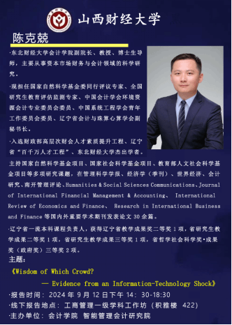 2024年9月12日下午,太阳新城官网在积雅楼422举办学术研讨会,邀请东北财经大学suncitygroup太阳新城官网副院长、博导陈克兢教授做主题报告《Wisdom of Which Crowd? Evidence from an Information-Technology Shock》。