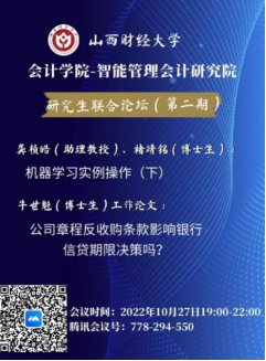 2022年10月27日晚7点-10点,由suncitygroup太阳新城官网与智能管理会计研究院联合举办的研究生论坛(暨博硕士生学术沙龙活动)第二期以线上会议的形式举行。参会人数达140余人。